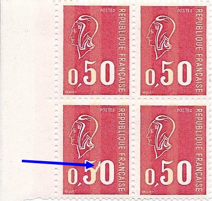 We saw in the The aspects of the 0,50 F Marianne de Béquet stamp the definition of the notions of aspect and of variety. Thus let us remind that a variety is an accidental modification of one of the industrial components constituting the postage stamp. In this article, I will show a certain number of what I regard as a variety and I will try, each time, to explain the technical cause of the variety. As all the presentations of the stamp 0,50F Marianne de Béquet were produced by intaglio process, stamps marketed in sheets, booklets or coils will be considered in this article, since the technical causes of these varieties are generally similar.